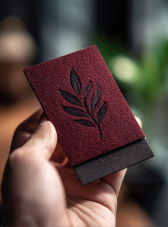 A hand holds a rectangular red box with a black leaf design on the front. The composition features soft, natural lighting. The box, made of a felt-like material, is set against a blurred background. Suitable for design, lifestyle, or marketing projects, and conceptual presentations.