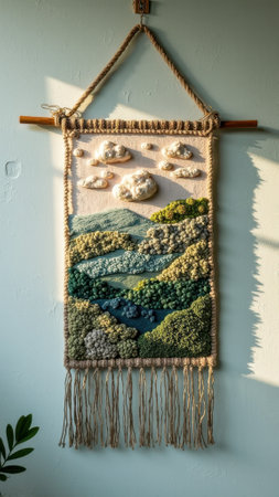 Handmade tapestry wall hanging depicting scenic landscape with clouds. That the image is generated using AI.
