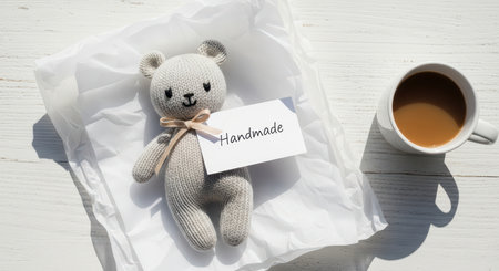 Handmade knitted teddy bear with gift card and coffee on white wooden table