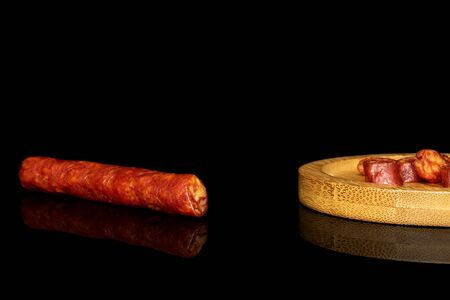 One half lot of slices of piquant smoked sausage on round bamboo coaster isolated on black glass