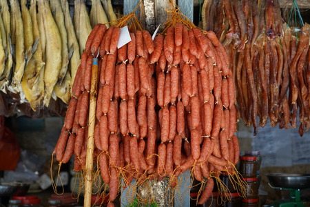 Traditional Thai Food North-Eastern Thai Style homemade, E-san Sausage homemade Sausages hanging at an outdoor market.