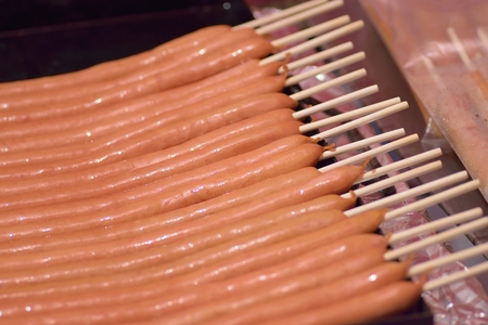Traditional hot dog preparation on coal fire on the street during the Christmas market