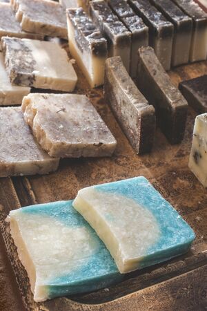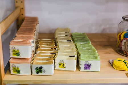 Assortment of handmade soap bars in a shop window. Selective focus.