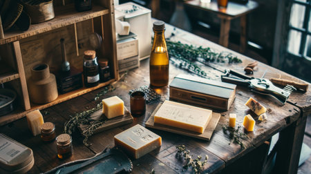 Soap making supplies including bars of soap, bottles, and herbs arranged on a rustic wooden table. Perfect for themes related to crafts, soap making, and rustic decor.
