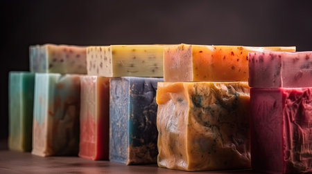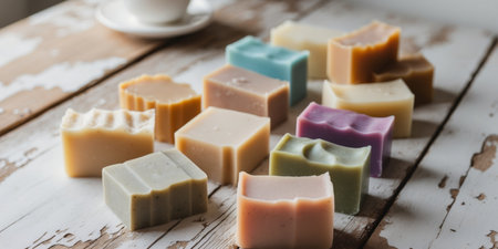 AI Generated. Assorted Colorful Homemade Soap Bars on Rustic Wooden Surface