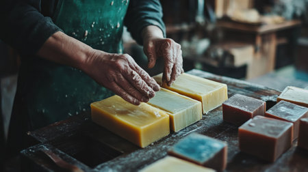 A skilled artisan uses a knife to cut colorful handmade soap blocks in a workshop. The scene showcases the beauty of craftsmanship and creativity in soap making.