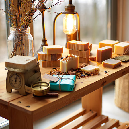 An arrangement of handmade soap bars displayed on a rustic wooden table creates a warm and inviting atmosphere The soaps in varying shades and textures are interspersed with natural elements like twigs dried leaves and a small wrapped gift in a vibrant blue hue An antique scale sits on the left adding to the vintage charm A decorative lamp with a filament bulb casts a soft glow enhancing the overall artisanal and organic feel of the composition ideal for illustrating concepts related to natural skincare handmade crafts or sustainable living