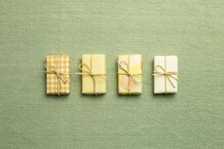 Yellow gift boxes on green fabric background. flat lay, top view, copy space
