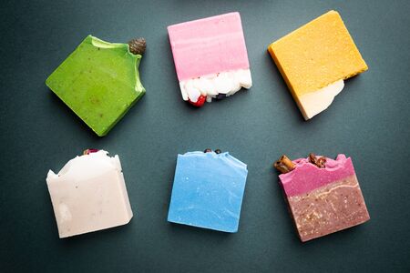 Lump hand soap. Hygiene and prevention of viral diseases concept. Variety of colorful natural soap bars, close-up, selective focus.