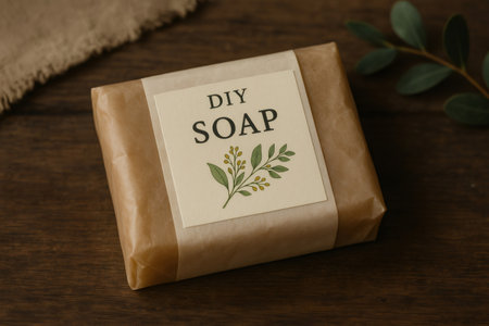 Close up of a bar of soap wrapped in brown paper resting on a wooden table, featuring a DIY label and a sprig of greenery