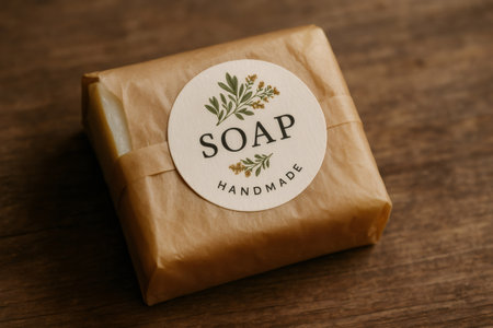 Natural handmade soap wrapped in brown paper with a circular label, featuring botanical illustrations, resting on a rustic wooden surface