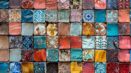 A vibrant arrangement of colorful vintage tiles showcases a rich mosaic pattern, ideal for backgrounds or decorative elements in design projects.