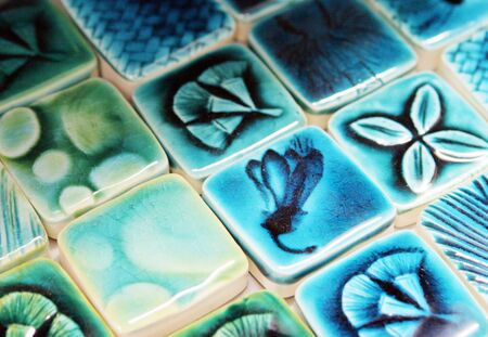 Close up of various decorative ceramic tiles showing diverse patterns, colors, and textures, forming an aesthetically pleasing arrangement