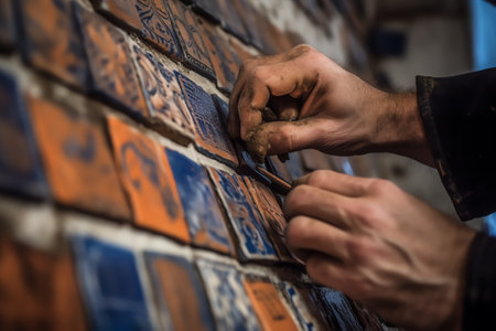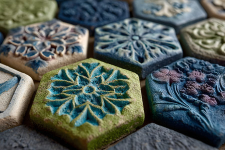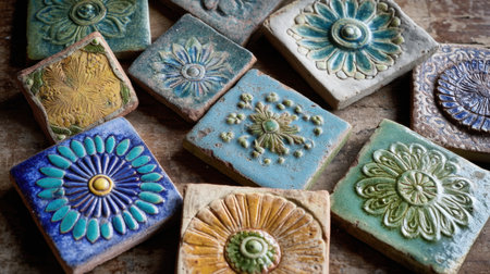 Close-up of rustic embossed clay tiles with intricate patterns on wooden surface. That the image is generated using AI.