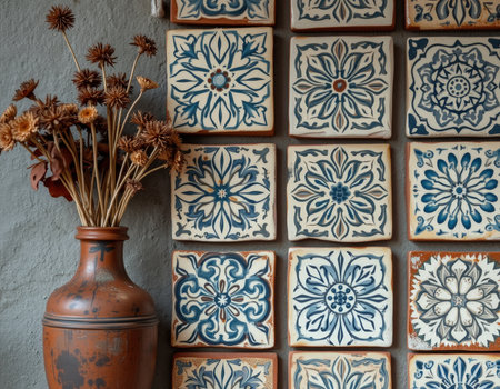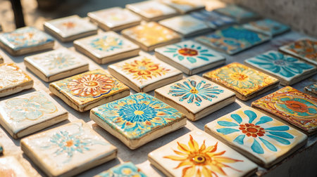 The vibrant ceramic tiles showcase intricate floral patterns in various colors, reflecting the artistry and craftsmanship found in a local market.