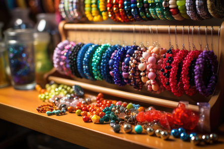 rack filled with colorful beads and thread for crafting, created with generative ai
