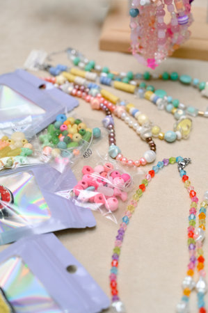 Colorful Beads and Jewelry Making Supplies on Rustic Wooden Table for Creative Crafting Projects