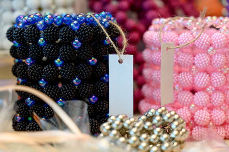A close-up of black and pink beaded bracelets for sale. A set of massive bracelets made of handmade beads and beads with price tags.