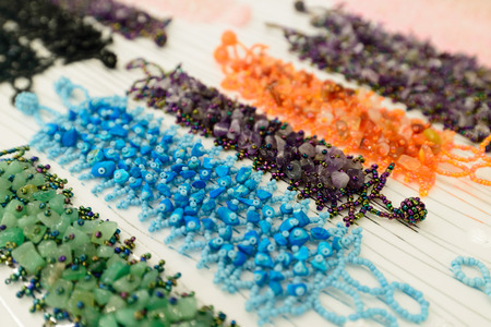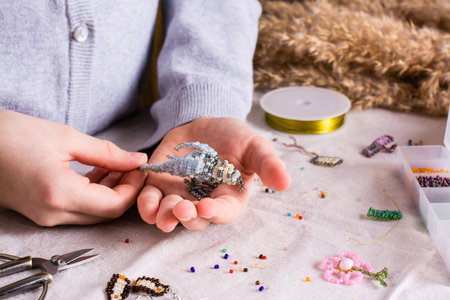 Close up of hands woman jewelry designer. She is sitting at a workspace with tools on it and is creating jewelry by stringing beads on fishing line. The process of creating jewelry. Small business.