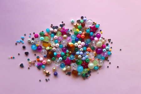 Colorful DIY necklaces, friendship bracelets and various plastic beads on pastel pink background. Flat lay.