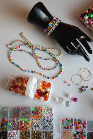 Hand figurine, colorful friendship bracelets, necklaces, various beads and DIY supplies on the table. Making jewelry at home. Flat lay.