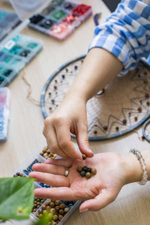 Artistic female hands use colorful beads for creating native tribal Indian amulet dreamcatcher closeup. Craftsman enjoying work or hobby at workshop making handmade medieval culture totem decor