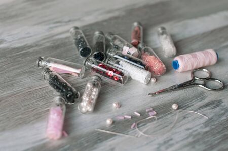 Bright little glass jars with colored beads and tools for needlework lie on a gray wooden table