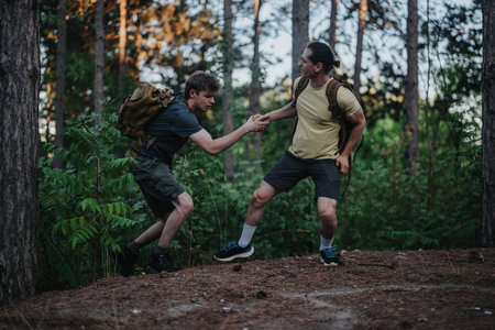 Two hikers in a forest shake hands on a trail, showing teamwork and friendship during a hike
