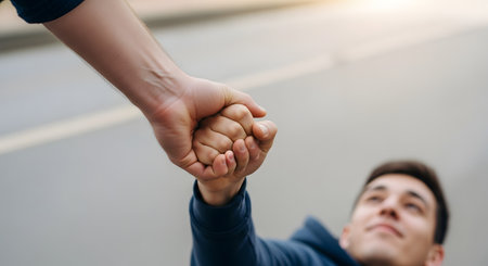 A close-up view of one person's hand grasping another's to pull them up, symbolizing help and support. The perspective emphasizes themes of rescue, teamwork, trust, and overcoming obstacles together.