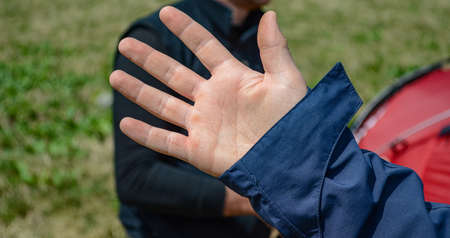 man refusing hand shake with his friend to protect herself from coronavirus in public areas. Prevention of fight against pandemic. Non-contact greeting. Quarantine methods to control spread of virus.
