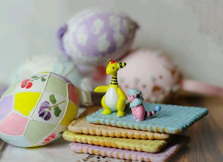 Assortment of colorful toys for kids room decor and playtime displayed on a desk