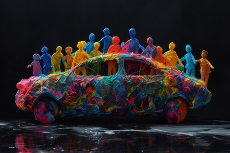 A multicolored passenger car made up of many people on a black background. The concept of the relationship between a car and a person. 3d illustration.