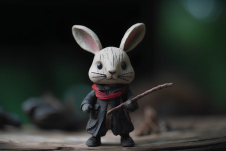 Rabbit doll with wooden stick on wooden table. Selective focus.