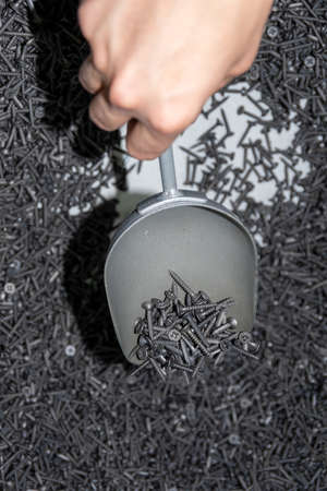 Hand holding a scoop for a set of black metal screws on a background of various black screws, top view, close-up.