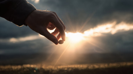 A hand reaches out to a bright light as the sun sets behind dark clouds. The scene evokes a feeling of wonder and tranquility.