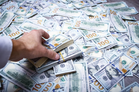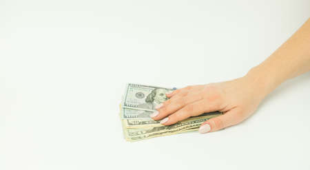 Dollars holding a banker in his hand on a black background. One hundred dollar bills. View from above.
