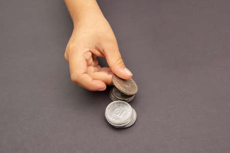 kid hands putting golden and silver coin on pile of coins. Concept of saving and spending money. Future investment. Long-term economic planning. Selective focus. Copy space.