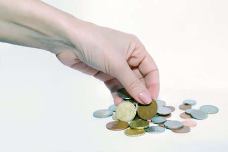 Hand of person with dirty fingers putting coin on pile with table in foreground and copy space.