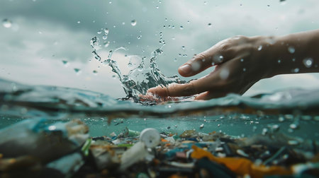 Plastic Waste In The Environment - Ocean Pollution - The fingers lift the water over the edge, and underneath it is depicted garbage and plastic. Environmental pollution