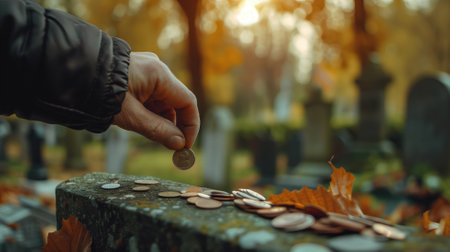 Hand is placing coin on weathered gravestone covered in autumn leaves