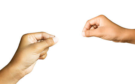 Closeup hand of a woman holding Thai-money sent to hand of a man, viruses and bacteria. Concept. Covid-19 or Coronavirus, isolated white background.