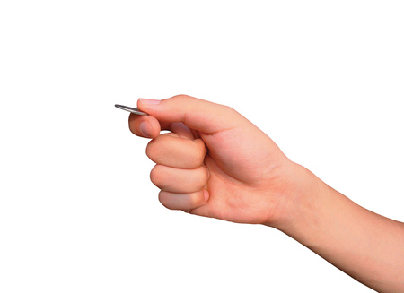 credit card online payments. personal finances and money management. hand holding bank card on white background.