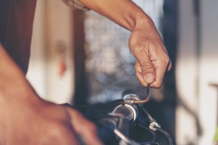 Close up male hands arms holding fixing old vintage camera hobby mechanical parts camera lens on table unrecognizable man repairman fix breaks it down into details photographer repair photo equipment