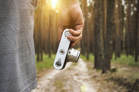 Vintage film camera in male hands on a hike in nature.