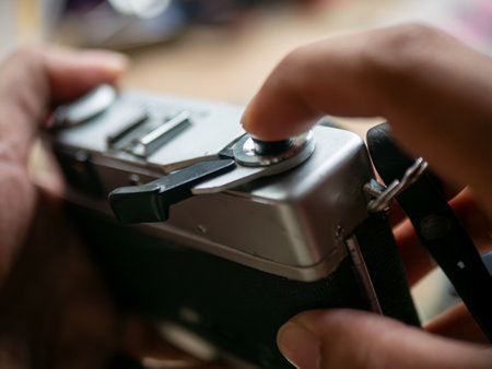 Photographer Hand Pressing Shutter Button on Vintage Film Camera Taking Picture Action Shot