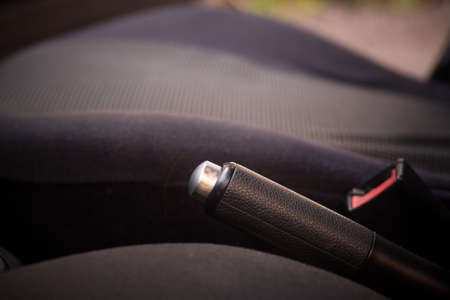 Close up of an elegant car armrest upholstered in black handmade leather. Interior view
