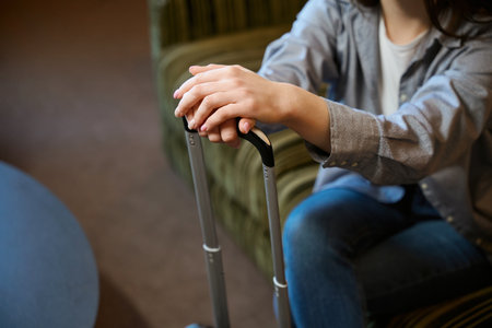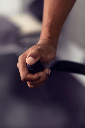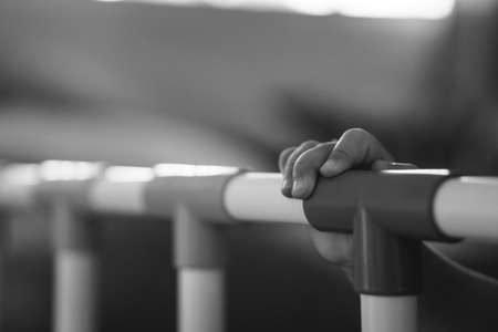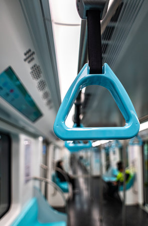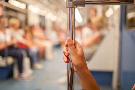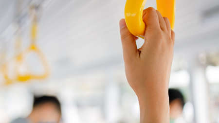 young passenger woman hand holding Handle on the train or on the bus for safety. Safety travel trip,