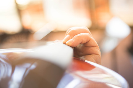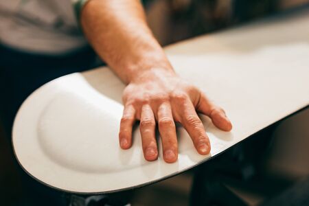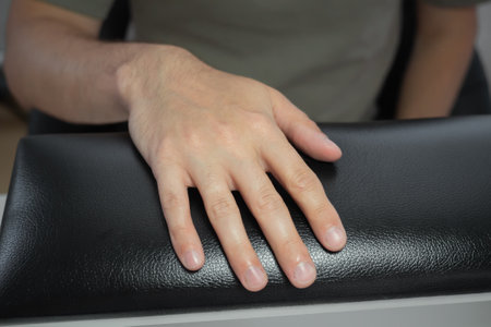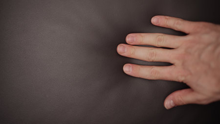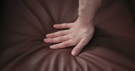 Close-up of hand holding white leather furniture armrest, showcasing comfort and modern design