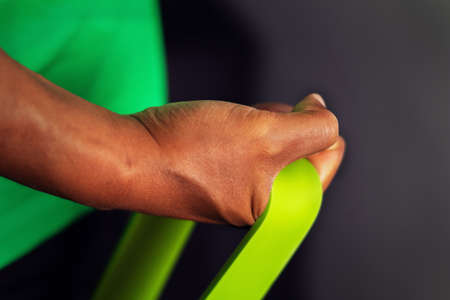 Girl in a sports store chooses a large abs trainer to buy. Concept of a healthy lifestyle, sports and physical activity. Hands close up shot