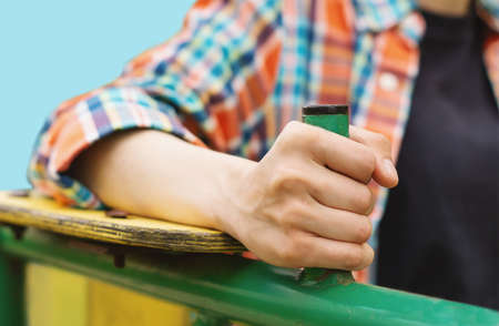 The hand of a tourist holding the handrail on the bus to get on the plane. Airplane, Travel, Hand, Airport, ticket, lifestyle concept.